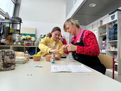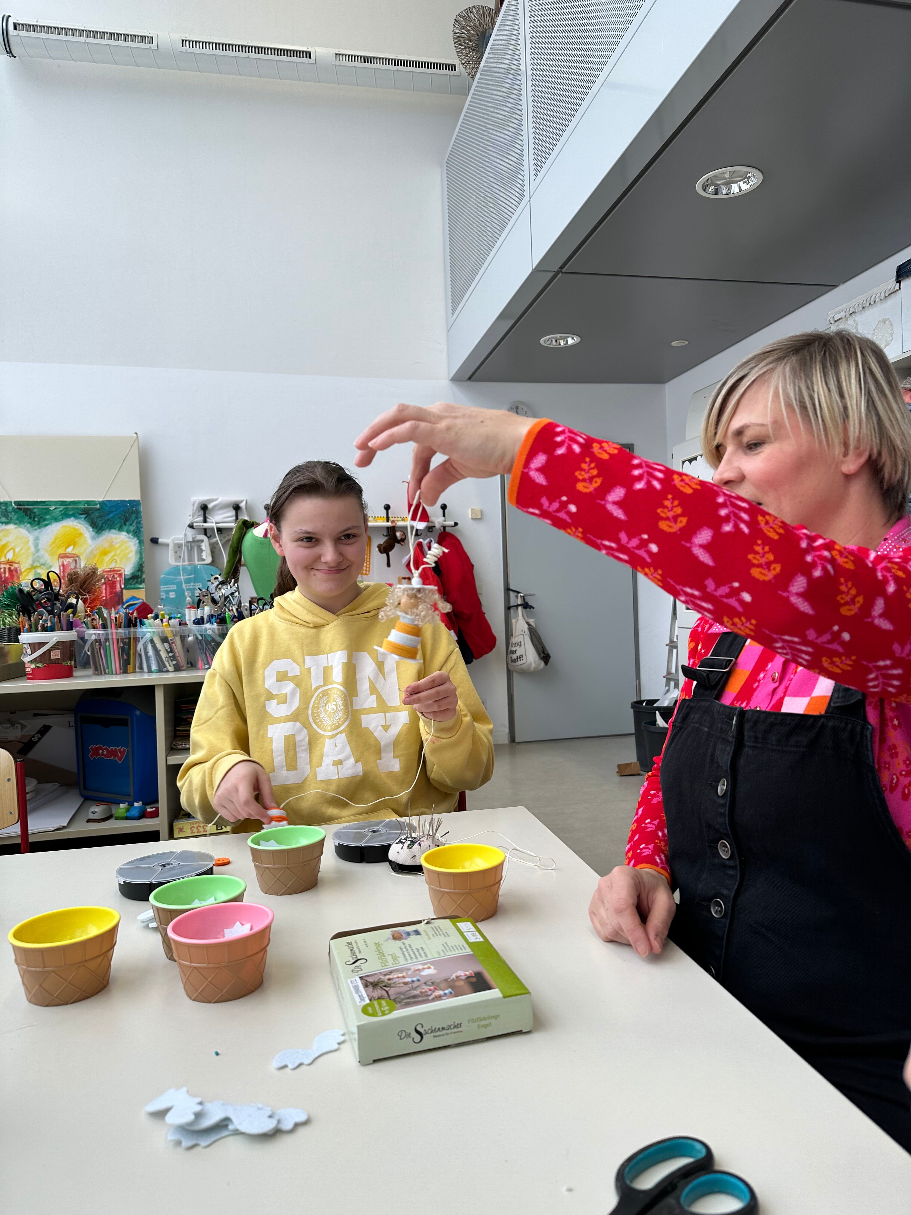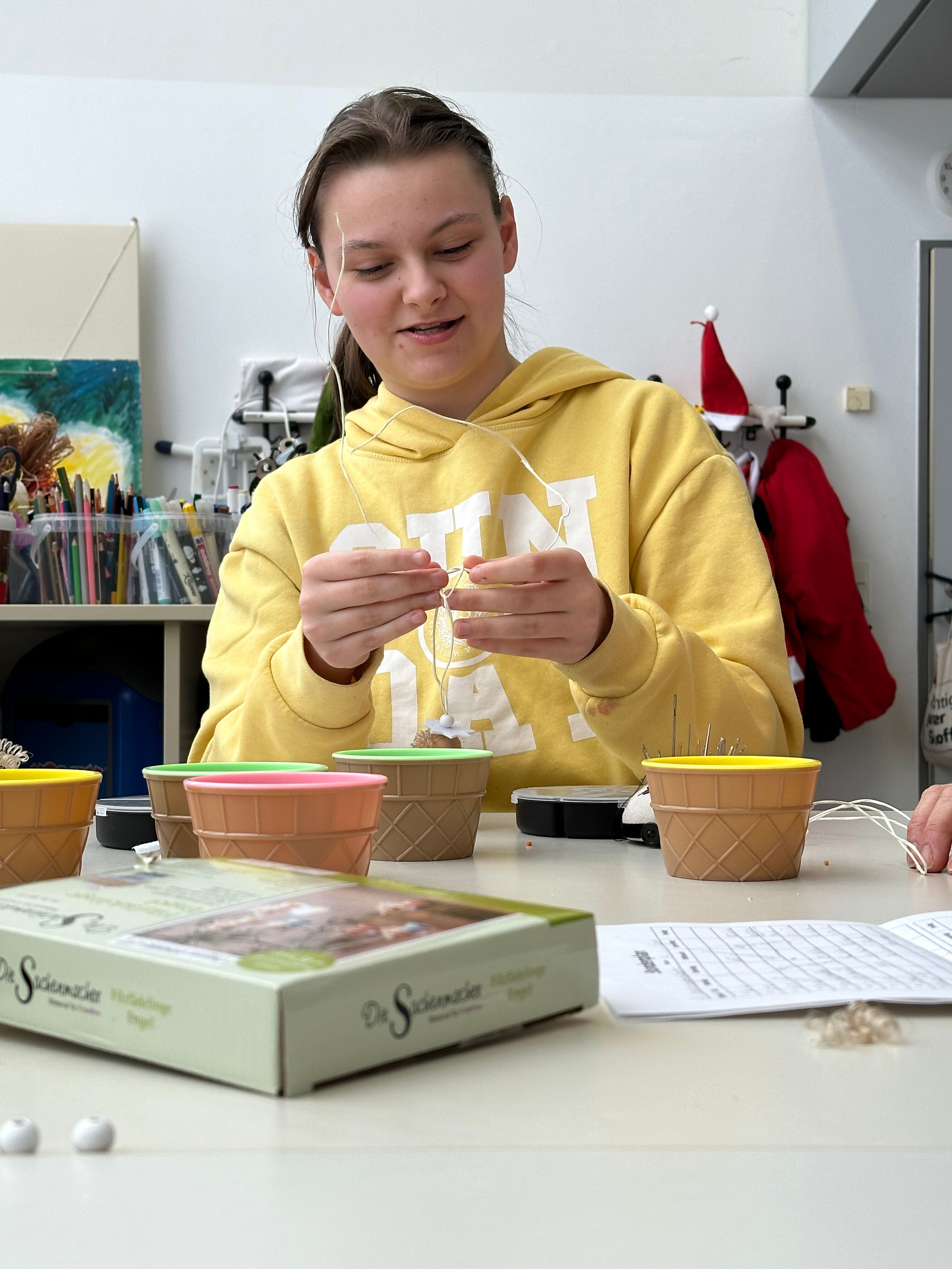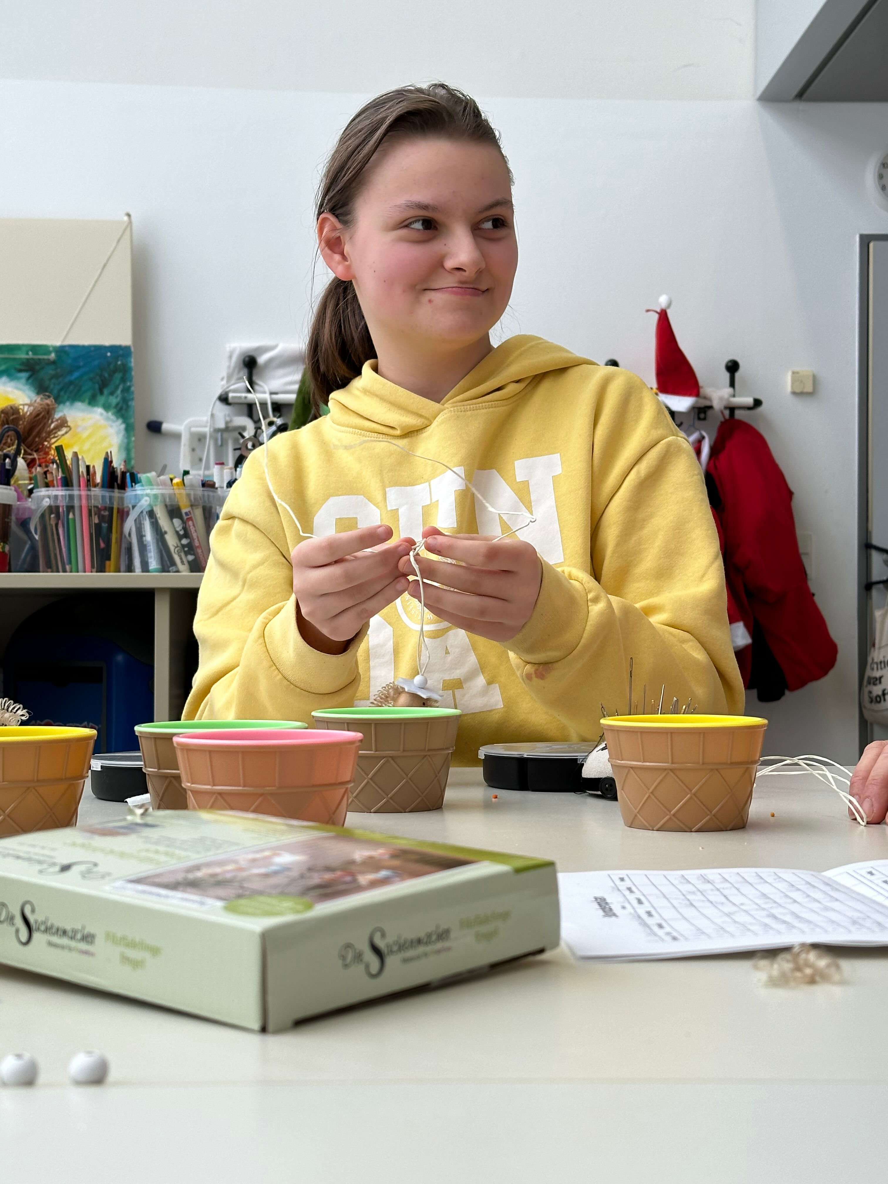 Für die jüngeren Klassen bietet sie vielfältige Möglichkeiten an, sich kreativ auszudrücken: Seifen und Kerzen herstellen, Bilder kleben, Taschen und Kissen nähen, T-Shirts bedrucken und vieles mehr. Bei unserem Besuch basteln die Kinder gerade Weihnachtsengel für den Adventsbasar. Die meisten Schüler*innen sind regulär einmal die Woche im Näh- bzw. Kreativunterricht. Spätestens zu den Märchenprojektwochen im Februar haben dann wirklich alle Schüler*innen die Möglichkeit, in die Werkstatt zu kommen.  „Wir machen hier eigentlich alles, was Spaß macht. Auch mal Malen nach Musik.