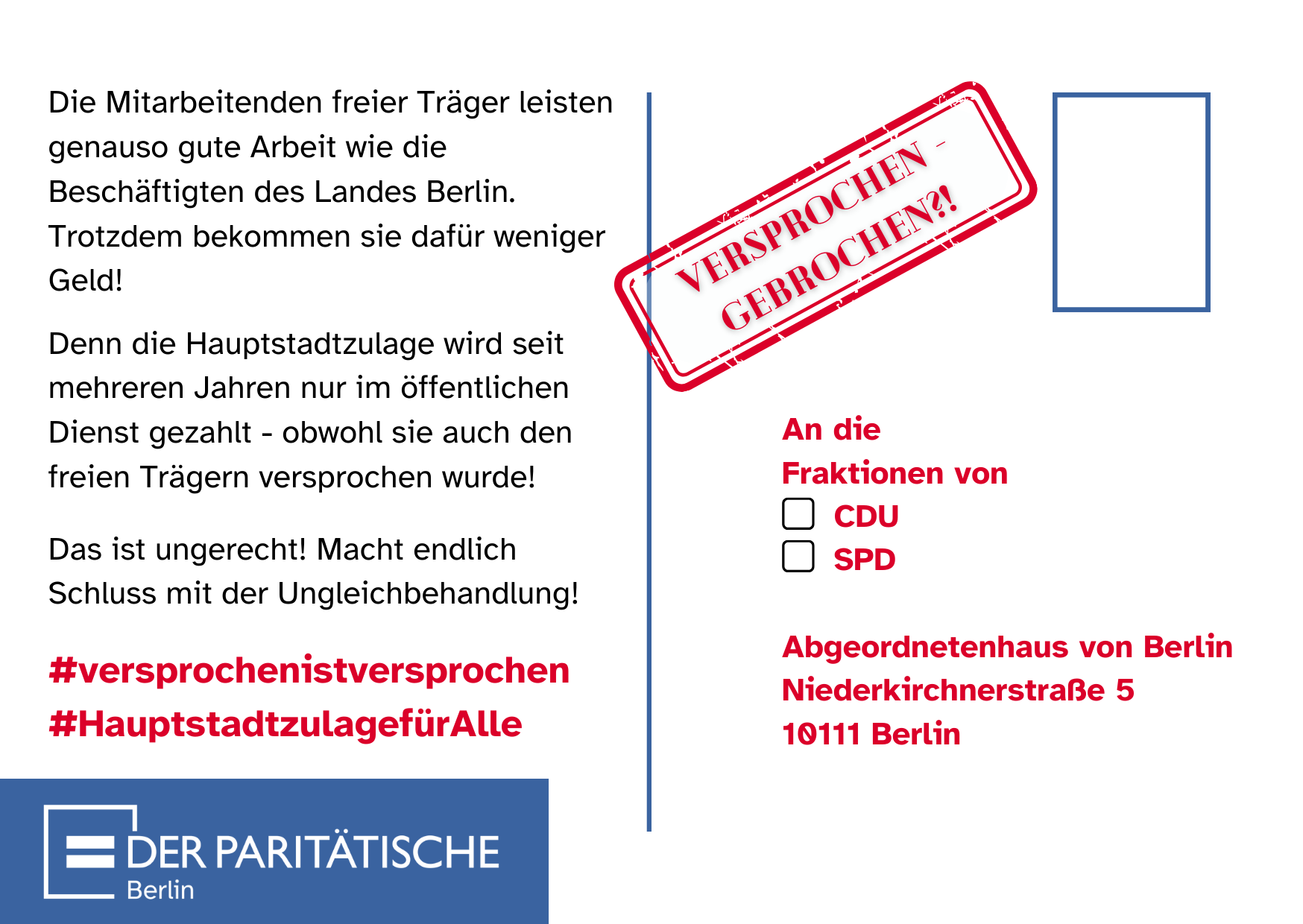 Gemeinsam mit den anderen Trägern der Liga werden wir mit Vertreter*innen der tandem BTL am 11. April 2024 vor dem Abgeordnetenhaus Berlin für Gleichberechtigung und Fairness demonstrieren. Zur Vorbereitung gibt es eine Postkartenaktion des Paritätischen Berlins, an der wir teilnehmen. In unserer Geschäftsstelle, Potsdamer Str. 182, können die Postkarten abgeholt werden. Wer sich mit den Beschäftigten der Freien Träger solidarisieren will, kann die Postkarte ausfüllen und direkt bei uns lassen. Wir werden diese am 11. April mitnehmen und im Abgeordnetenhaus abgeben!